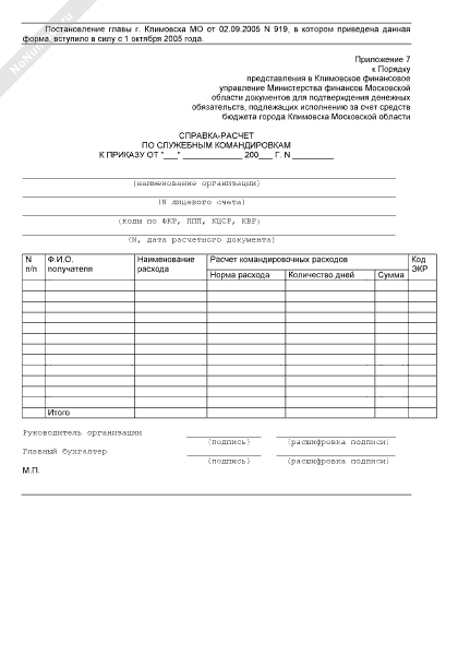 - 1191Справка-расчет по служебным командировкам для подтверждения денежных обязательств, подлежащих исполнению за счет средств бюджета города Климовска Московской области