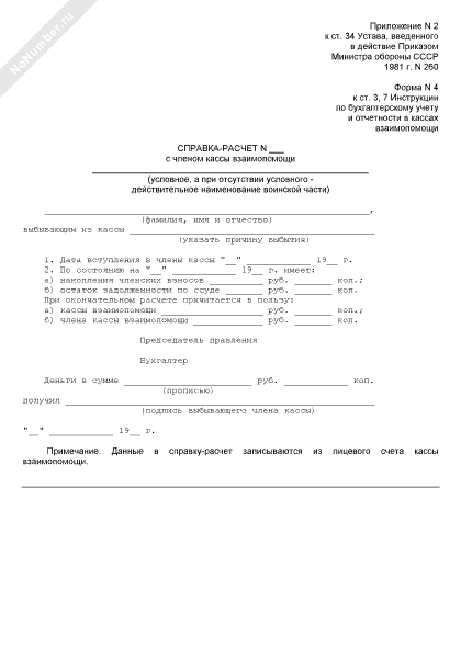 - 1192Справка-расчет с членом кассы взаимопомощи, выбывающим из кассы при воинской части (форма № 4)