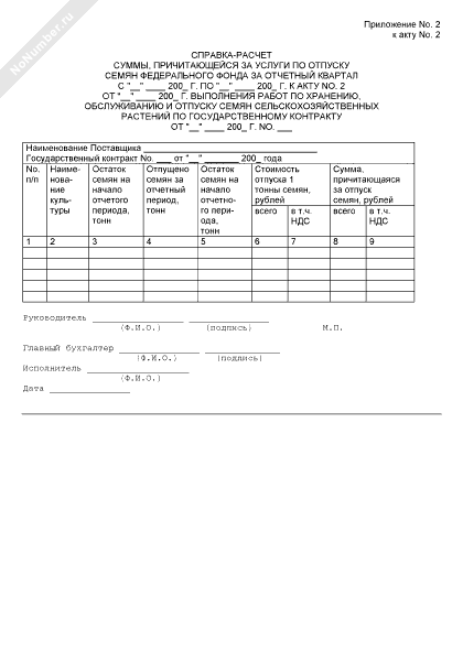 - 1185Справка-расчет суммы, причитающейся за услуги по отпуску семян федерального фонда, за отчетный квартал к акту выполнения работ по хранению, обслуживанию и отпуску семян сельскохозяйственных растений по государственному контракту