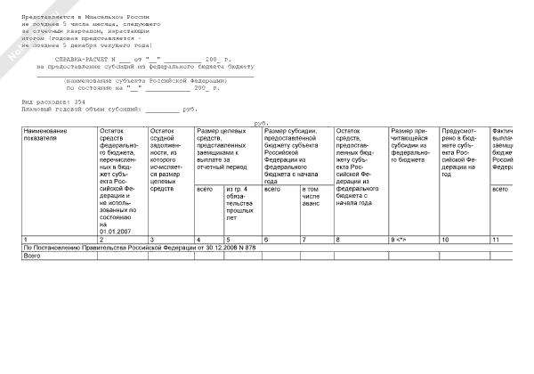 - 1224Справка-расчет на предоставление субсидий из федерального бюджета бюджету субъекта Российской Федерации (согласно Постановлению Правительства Российской Федерации от 28.12.2006 № 879)