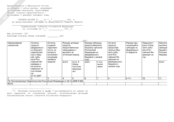 - 1225Справка-расчет на предоставление субсидий из федерального бюджета бюджету субъекта Российской Федерации (согласно Постановлению Правительства Российской Федерации от 29.12.2006 № 834)