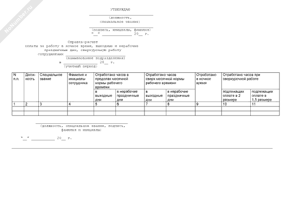 - 1226Справка-расчет оплаты за работу в ночное время, выходные и нерабочие праздничные дни, сверхурочную работу, выполненную сотрудниками структурного подразделения федеральной фельдъегерской связи