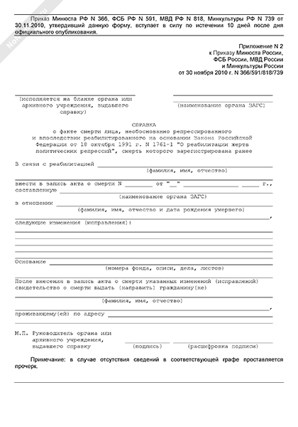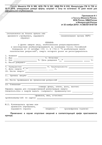 - 1299Справка о факте смерти лица, необоснованно репрессированного и впоследствии реабилитированного на основании Закона Российской Федерации от 18 октября 1991 г. N 1761-1 «О реабилитации жертв политических репрессий», смерть которого ранее не регистрировалась