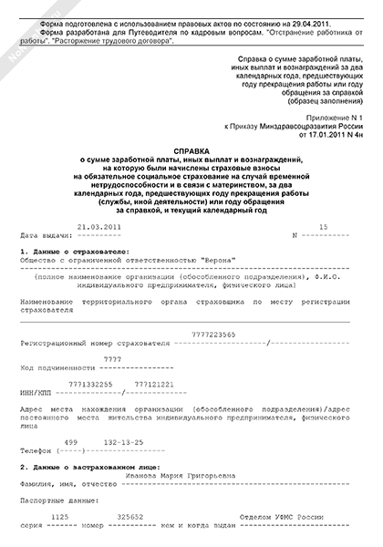 - 1296Справка о сумме заработной платы, иных выплат и вознаграждений, на которую были начислены страховые взносы на обязательное социальное страхование на случай временной нетрудоспособности и в связи с материнством, за два календарных года, предшествующих году прекращения работы (службы, иной деятельности) или году обращения за справкой, и текущий календарный год