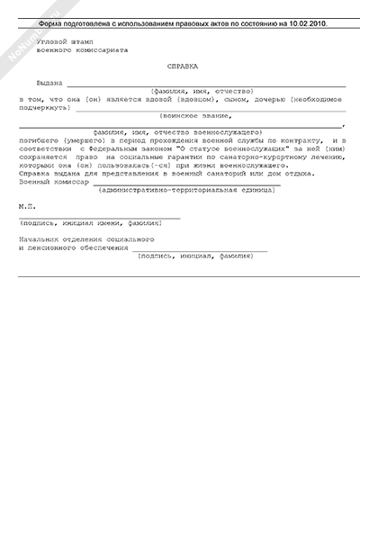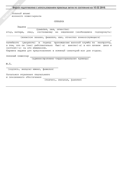 - 1320Справка, удостоверяющая родственное отношение к военнослужащему погибшему (умершему) в период прохождения военной службы по контракту, выдаваемая военным комиссариатом для представления в военный санаторий или дом отдыха