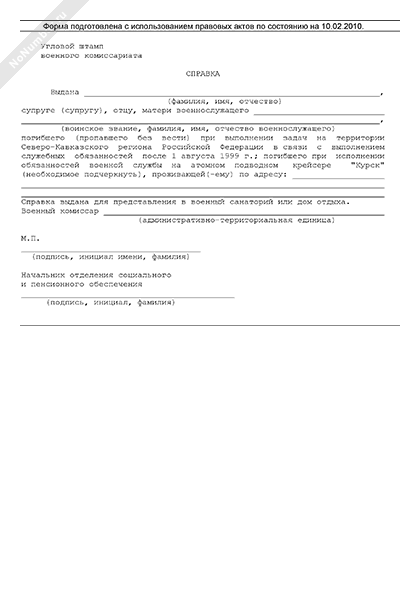 - 1319Справка, удостоверяющая родственное отношение к погибшему военнослужащему, выдаваемая военным комиссариатом для представления в военный санаторий или дом отдыха