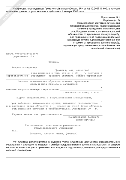 - 133Справка для подтверждения права гражданина на отсрочку от призыва на военную службу призывной комиссии, обучающегося по очной форме обучения в имеющем государственную аккредитацию образовательном учреждении среднего (полного) общего образования