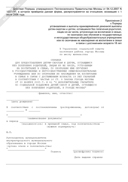 - 144Справка для предоставления детям-сиротам и детям, оставшимся без попечения родителей, лицам из их числа, устроенным на воспитание в семью, по окончании ими обучения в государственных и негосударственных общеобразовательных учреждениях или по окончании их нахождения на воспитании в семье в связи с достижением возраста 18 лет гарантий в соответствии с частью 14 ст. 8 Закона города Москвы от 30 ноября 2005 г. № 61