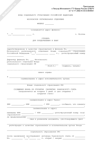 - 142Справка для предъявления в банк (выдается филиалами Московского регионального отделения Фонда социального страхования Российской Федерации организациям, зарегистрированным в качестве страхователей на территории города Москвы)
