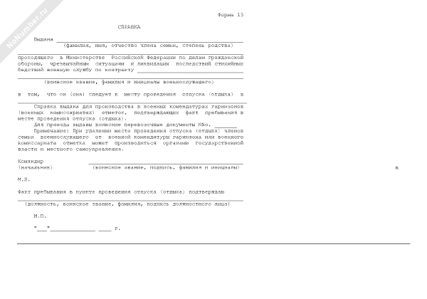 - 146Справка для производства в военных комендатурах гарнизонов (военных комиссариатах) отметок, подтверждающих факт пребывания в месте проведения отпуска (отдыха) (форма № 13)