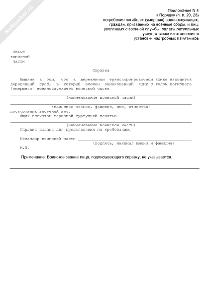 - 155Справка из воинской части об отсутствии посторонних вложений в транспортировочном ящике с телом погибшего (умершего) военнослужащего