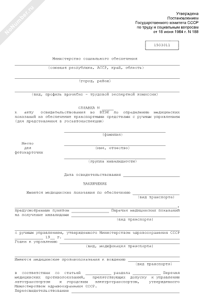 - 159Справка к акту освидетельствования во врачебно-трудовой экспертной комиссии по определению медицинских показаний на обеспечение транспортными средствами с ручным управлением (для представления в госавтоинспекцию). Форма № 1503011