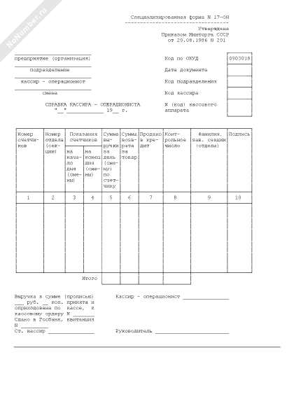 - 166Справка кассира-операциониста. Специализированная форма № 17-ОН