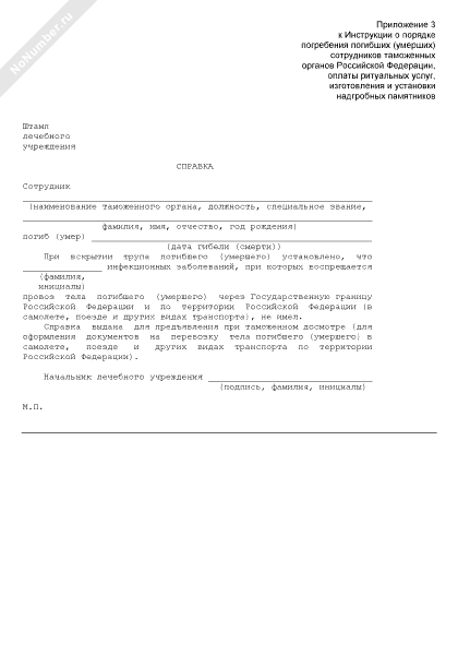 - 170Справка лечебного учреждения об отсутствии у погибшего (умершего) инфекционных заболеваний и показаний, воспрещающих провоз тела по территории Российской Федерации и через Государственную границу Российской Федерации