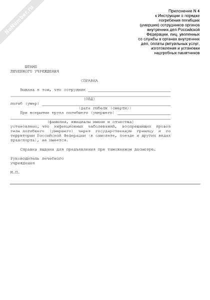 - 172Справка медицинского учреждения (в котором составлялось заключение о гибели (смерти)) об отсутствии у погибшего (умершего) сотрудника органов внутренних дел Российской Федерации инфекционных заболеваний