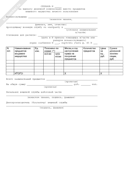 - 177Справка на выплату денежной компенсации вместо предметов вещевого имущества личного пользования военнослужащему, проходящему военную службу по контракту