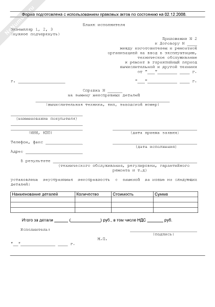 - 178Справка на замену неисправных деталей (приложение к договору между изготовителем и ремонтной организацией на ввод в эксплуатацию, техническое обслуживание и ремонт в гарантийный период вычислительной и другой техники)