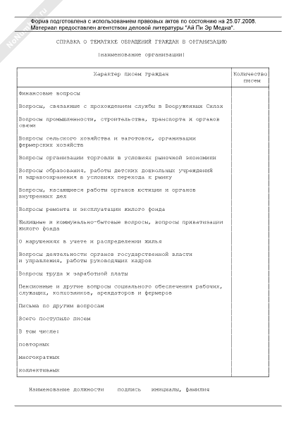 Справка о тематике обращений граждан в организацию