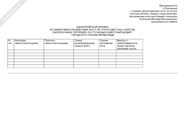 Аналитическая справка об эффективности действия льгот по уплате местных налогов, сборов и иных платежей, поступающих в местный бюджет городского поселения Мытищи Мытищинского района Московской области (рекомендуемый образец заполнения)