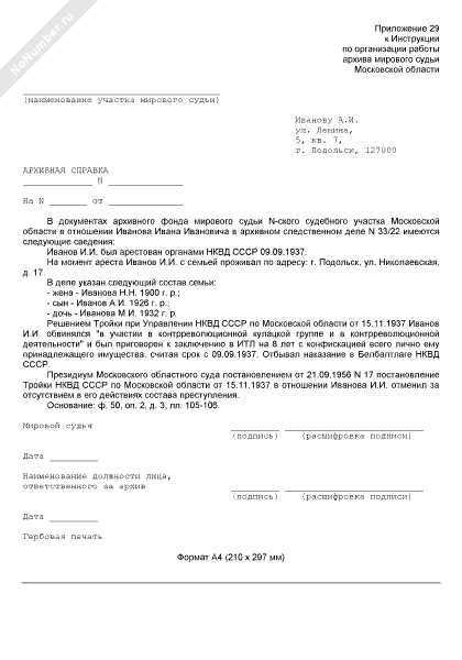 Архивная справка из архива мирового судьи Московской области (рекомендуемый образец заполнения)