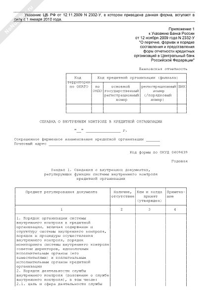 Справка о внутреннем контроле в кредитной организации