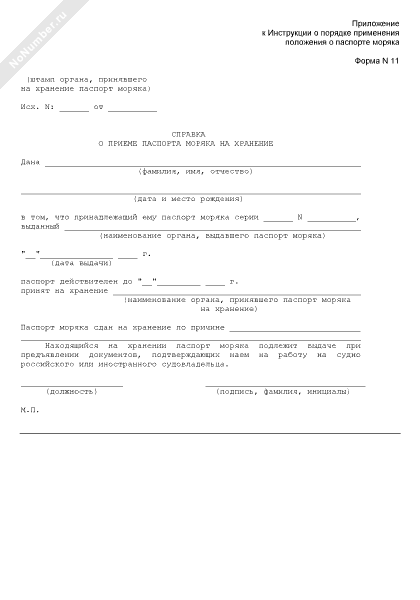 Справка о приеме паспорта моряка на хранение (форма № 11)