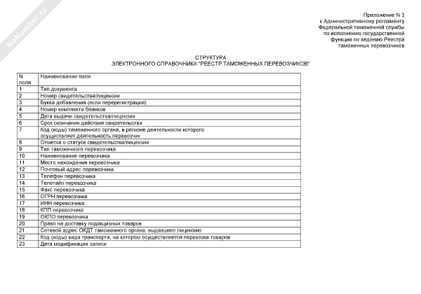 Структура электронного справочника «Реестр таможенных перевозчиков» (рекомендуемый образец заполнения)