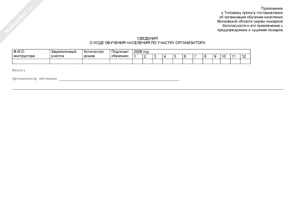 - 2065Сведения о ходе обучения населения по участку организатора (приложение к типовому проекту постановления об организации обучения населения Московской области мерам пожарной безопасности и его привлечению к предупреждению и тушению пожаров)