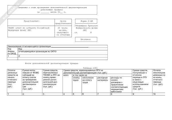 - 2069Сведения о ходе проведения дополнительной диспансеризации работающих граждан. Форма № 2-ДД (представляют ТФОМС по субъекту Российской Федерации фонду ОМС)