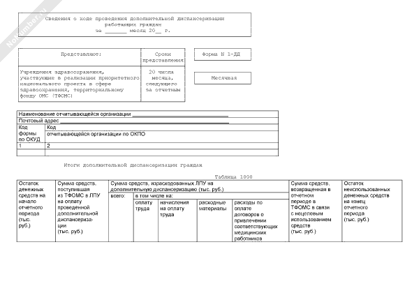- 2068Сведения о ходе проведения дополнительной диспансеризации работающих граждан. Форма № 1-ДД (представляют учреждения здравоохранения, участвующие в реализации приоритетного национального проекта в сфере здравоохранения, территориальному фонду ОМС (ТФОМС))