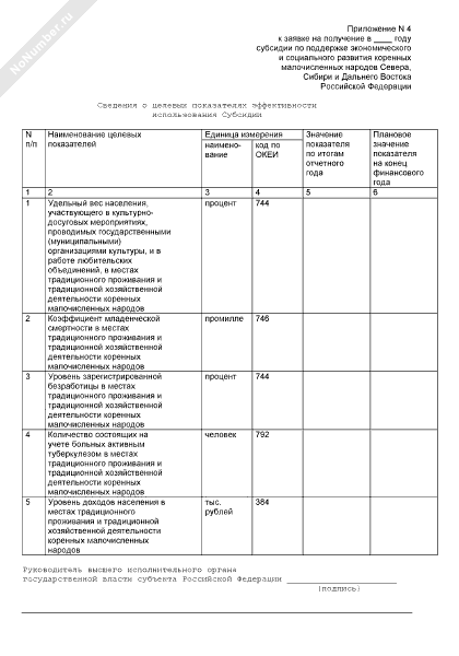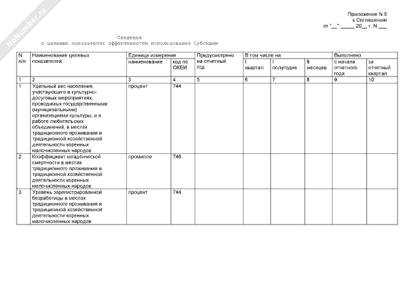 - 2077Сведения о целевых показателях эффективности использования субсидии (приложение к соглашению о предоставлении субсидии из федерального бюджета бюджету субъекта РФ на софинансирование расходных обязательств субъекта РФ (муниципальных образований) по поддержке экономического и социального развития коренных малочисленных народов Севера, Сибири и Дальнего Востока РФ)