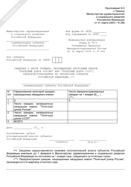 - 2116Сведения о числе граждан, награжденных нагрудным знаком «Почетный донор России» или «Почетный донор СССР», перерегистрированных на территории субъекта Российской Федерации. Форма № 76/у