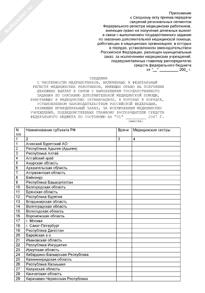 - 2105Сведения о численности медработников, включенных в федеральный регистр медицинских работников, имеющих право на получение денежных выплат в связи с выполнением государственного задания по оказанию дополнительной медицинской помощи, работающих в медицинских организациях, в которых размещен муниципальный заказ (приложение к сводному акту приема-передачи сведений региональных сегментов федерального регистра медицинских работников)
