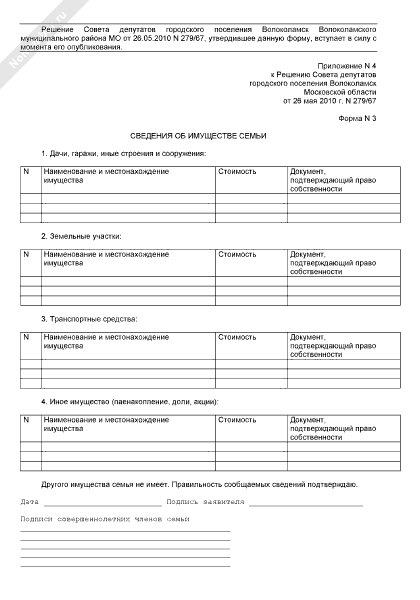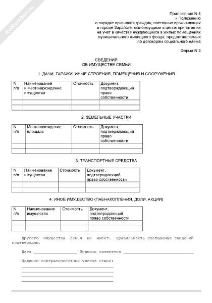 - 2256Сведения об имуществе малоимущей семьи для принятия ее на учет в качестве нуждающейся в жилых помещениях на территории городского поселения Зарайск Московской области (форма № 3)