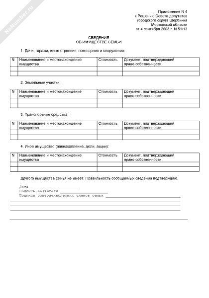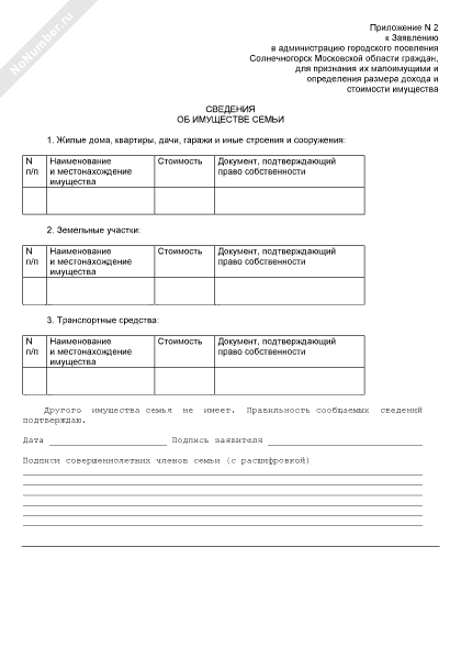 - 2255Сведения об имуществе семьи (приложение к заявлению в администрацию городского поселения Солнечногорск Московской области граждан, для признания их малоимущими и определения размера дохода и стоимости имущества)