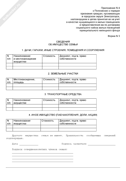 - 2250Сведения об имуществе семьи гражданина, проживающего в городском округе Электрогорск Московской области, подаваемые при обращении граждан в целях признания их малоимущими для принятия их на учет в качестве нуждающихся в жилых помещениях, предоставляемых по договорам социального найма (форма № 3)