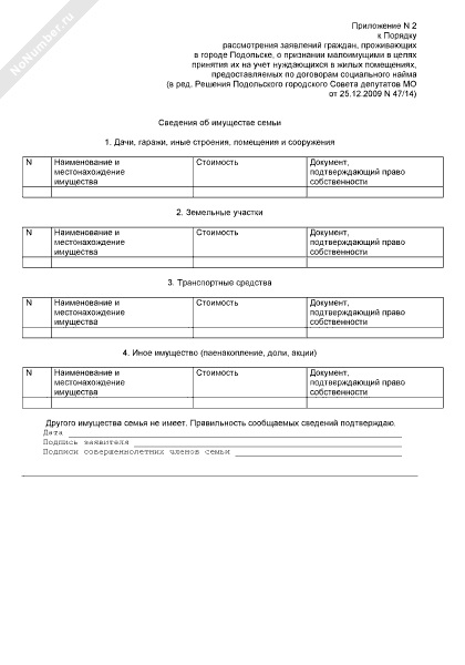 - 2251Сведения об имуществе семьи, проживающей в городе Подольске Московской области, для признания их малоимущими и постановки на учет как нуждающихся в жилых помещениях