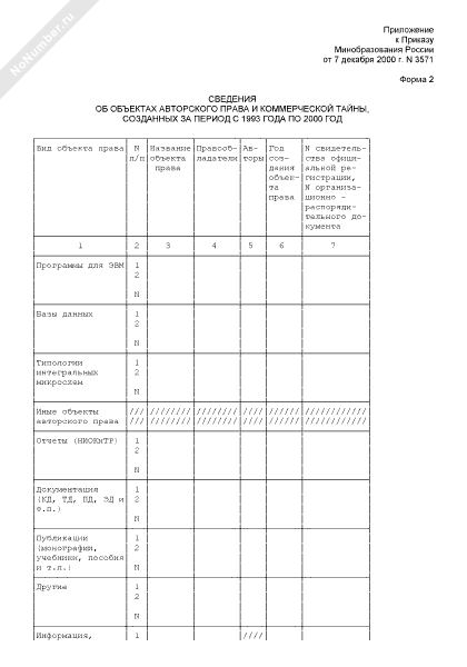 - 2260Сведения об инвентаризации результатов научно-технической деятельности, полученных за счет средств федерального бюджета. Сведения об объектах авторского права и коммерческой тайны, созданных за период с 1993 года по 2000 год (форма № 2)