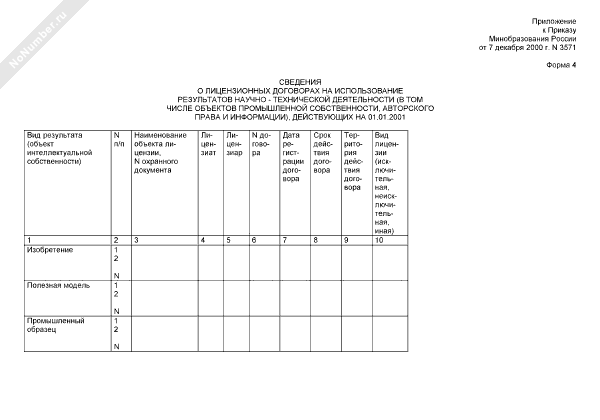 - 2262Сведения об инвентаризации результатов научно-технической деятельности, полученных за счет средств федерального бюджета. Сведения о лицензионных договорах на использование результатов научно-технической деятельности (в том числе объектов промышленной собственности, авторского права и информации), действующих на 01.01.2001 (форма № 4)