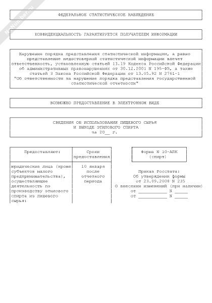 - 2376Сведения об использовании пищевого сырья и выходе этилового спирта. Форма № 10-АПК (спирт) (годовая)