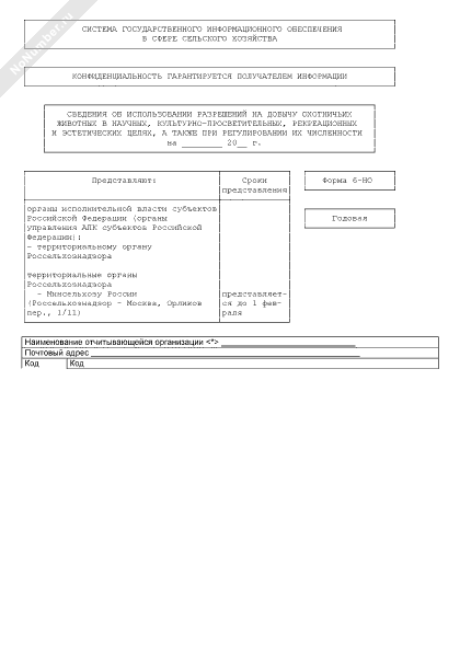 - 2364Сведения об использовании разрешений на добычу охотничьих животных в научных, культурно-просветительных, рекреационных и эстетических целях, а также при регулировании их численности. Форма № 6-НО