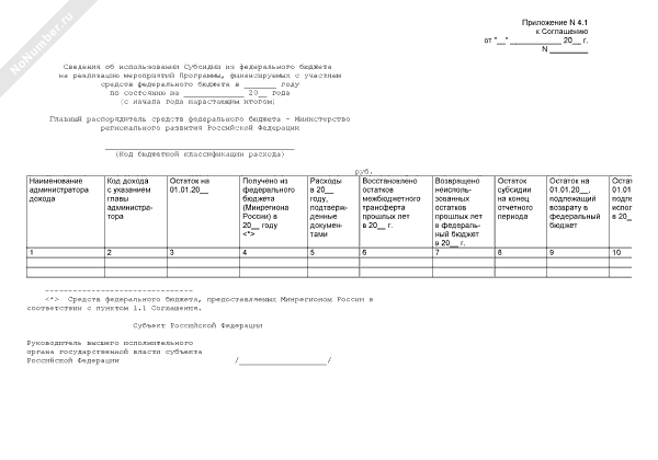 - 2374Сведения об использовании Субсидии из федерального бюджета на реализацию мероприятий Программы, финансируемых с участием средств федерального бюджета (приложение к соглашению о предоставлении субсидии из федерального бюджета бюджету субъекта Российской Федерации на софинансирование расходных обязательств субъекта Российской Федерации (муниципальных образований) по реализации мероприятий федеральной целевой программы (подпрограммы))