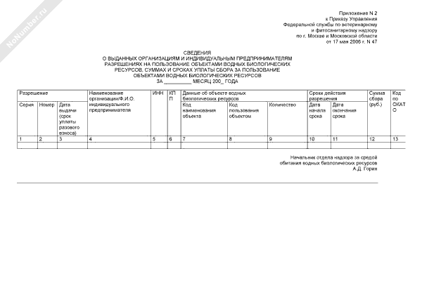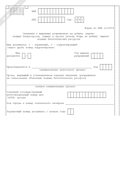 - 226Сведения о выданных разрешениях на добычу (вылов) водных биоресурсов, суммах и сроках уплаты сбора за добычу (вылов) водных биологических ресурсов. Форма № 1114004