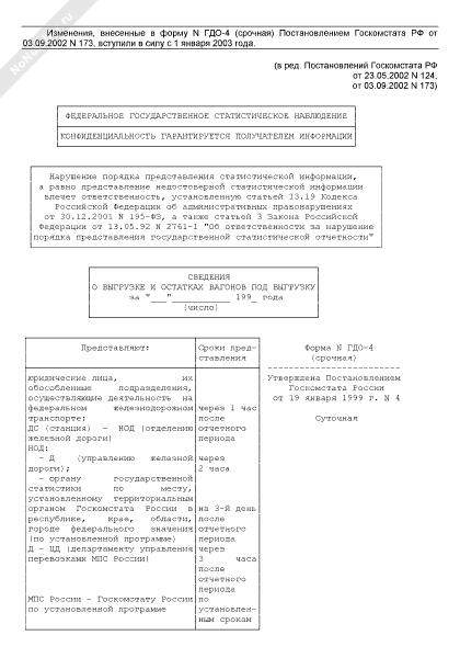 - 225Сведения о выгрузке и остатках вагонов под выгрузку. Форма № ГДО-4 (срочная)