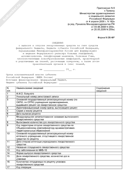 - 234Сведения о выписке и отпуске лекарственных средств за счет средств федерального бюджета, бюджета субъекта Российской Федерации, передаваемые Минздравсоцразвития России для формирования и ведения Федерального регистра больных гемофилией, муковисцидозом, гипофизарным нанизмом, болезнью Гоше, злокачественными новообразованиями лимфоидной, кроветворной и родственных им тканей, рассеянным склерозом, а также после трансплантации органов и (или) тканей. Форма № 06-ФР