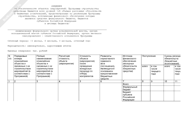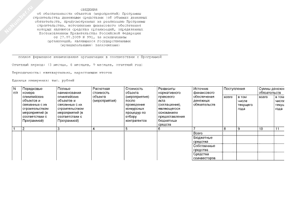 - 2426Сведения об обеспеченности объектов (мероприятий) Программы строительства денежными средствами (об объемах денежных обязательств, предусмотренных на реализацию Программы строительства, источниками финансового обеспечения которых являются средства организаций, определенных Постановлением Правительства Российской Федерации от 27.07.2009 № 991, за исключением организаций, являющихся государственными (муниципальными) заказчиками)