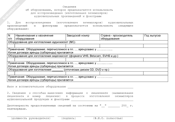 - 2434Сведения об оборудовании, которое предполагается использовать для воспроизведения (изготовления экземпляров) аудиовизуальных произведений и фонограмм