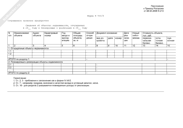 - 2515Сведения об объектах недвижимости, отчужденных и планируемых к реализации предприятием, находящимся в сфере ведения и координации Роспрома. Форма № VII/8