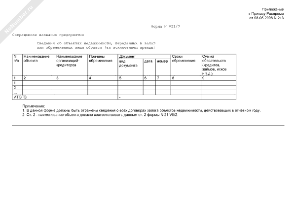 - 2514Сведения об объектах недвижимости, переданных в залог или обремененных иным образом (за исключением аренды). Форма № VII/7