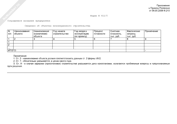 - 2513Сведения об объектах незавершенного строительства предприятия, находящегося в сфере ведения и координации Роспрома. Форма № VII/5